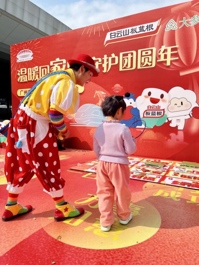 在广州白云站广场上,“马上开心”小丑互动秀通过魔术、气球编制及趣味问答,吸引大量旅客驻足参与。答对问题或合影分享的旅客,可获得白云山板蓝根颗粒、白云山口炎清颗粒或白云山感冒灵颗粒等礼品。